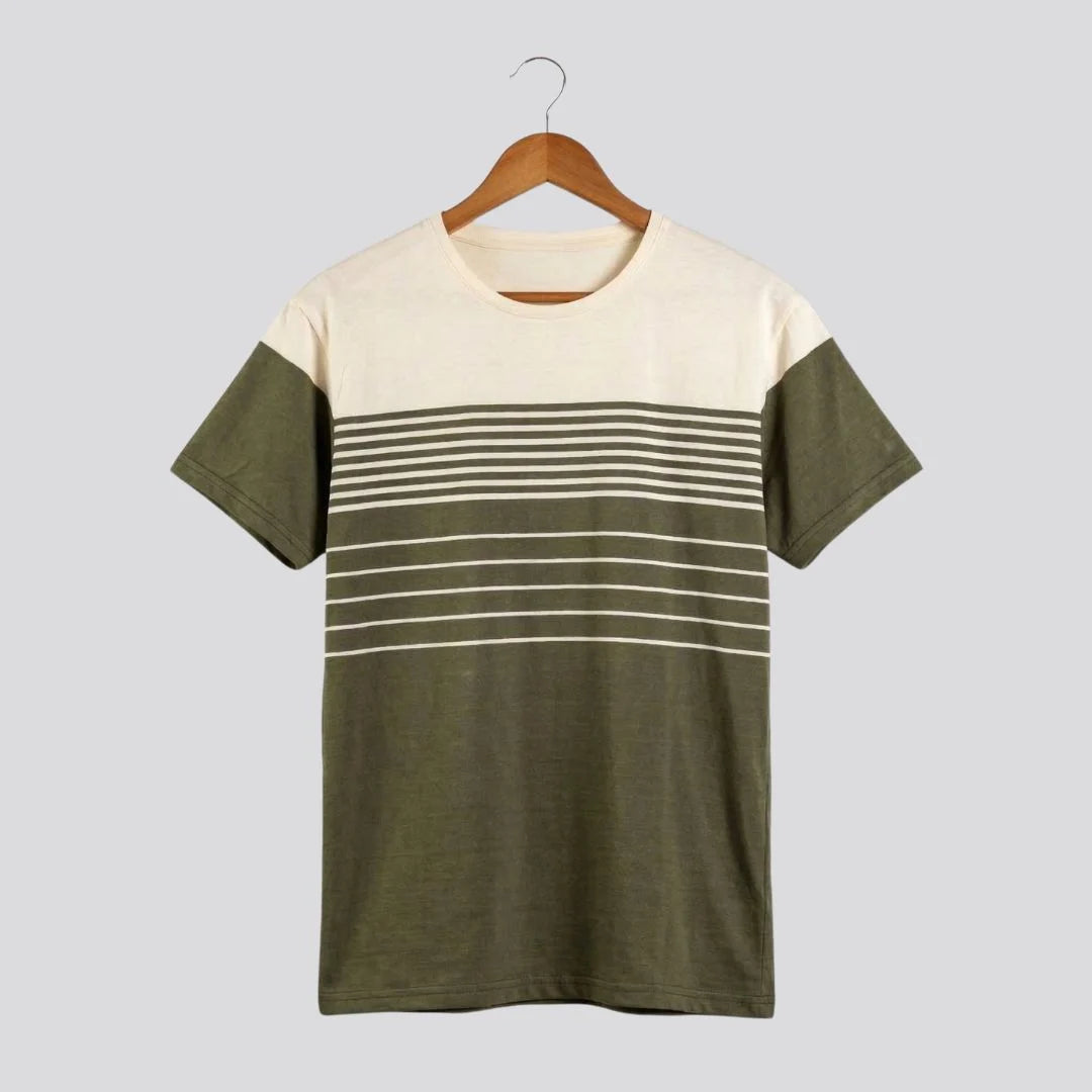 - Camiseta verde militar y blanca hueso con rayas.